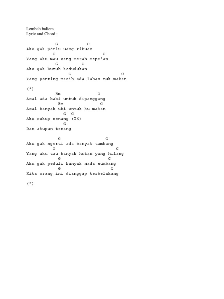 Intro G C F - F G C F - F G C F - F G C C - B - Am - F C - B - Am - F C F aku gak perlu uang ribuan C F yang aku mau uang merah cepean C F aku gak butuh kedudukan C F yang penting masih ada lahan tuk makan Chorus Am F asal ada babi untuk di panggang Am F asal banyak ubi untuk ku makan C F aku cukup senang. Last edit on Sep 21 2019. Slank - Lembah Baliem - Gitartab41.